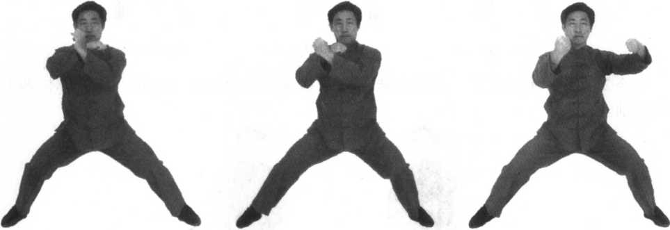 口令4(图9 -200至204) 重心由左向右再向左,同时两掌变拳,从左向右,交错搠开于
