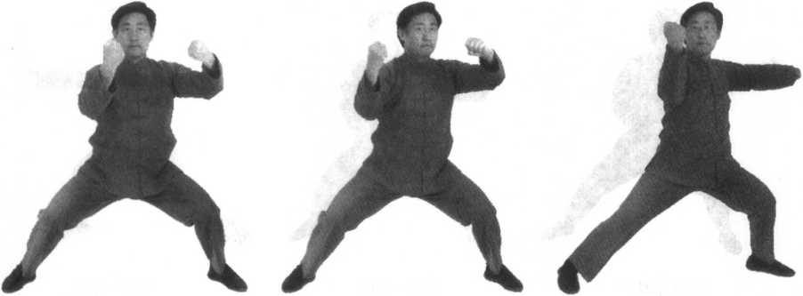 口令3(图9-211、212、213) 身体左转,重心移至左腿,同时右拳内旋向上划弧至身体左