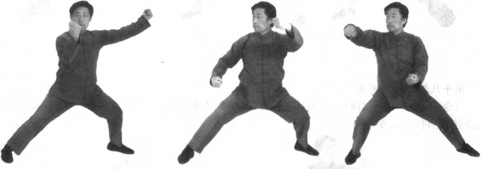 2.两掌变拳后的动作,须连贯为一,要在气贴脊背和以腰为轴的要求下进行动作;其关键在于特别扩大里外缠丝, 并要以前一缠丝带领后一缠丝;只有这样,才能使动作连而为一,并使内劲不丢。