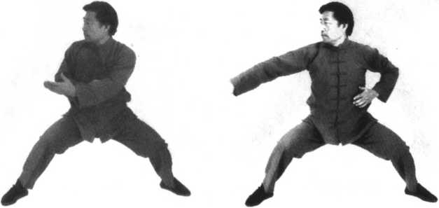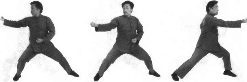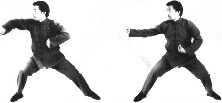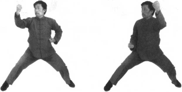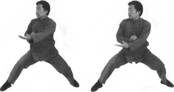 2.由上势发劲后,转而为合,合后再开;要在这合开之中,身体转体扭腰劲,转为左后右前的双托;双托在双顺缠中 要求产生合劲,为双推做好准备。