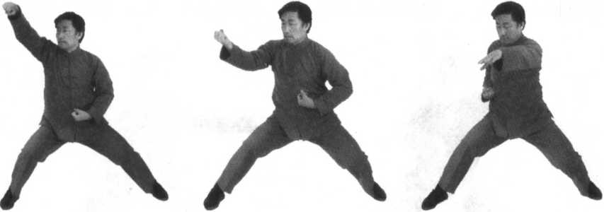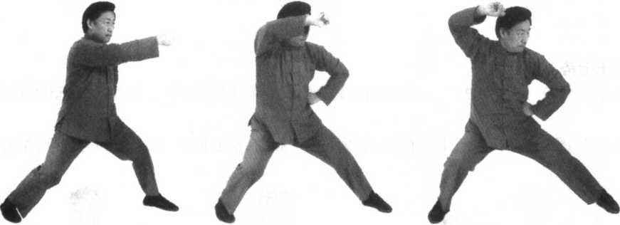 口令2(图9-219) 重心快速右移,同时,左肘后振,右拳上撩至右上方,拳心向下。