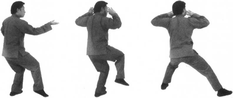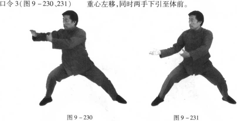 口令1 (图9 -226.227.228) 身体右转,重心先右后左,同时双手先外旋后内旋,右掌向