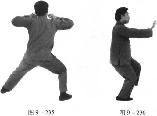 口令6(图9 -235 .236) 重心移至右腿,左腿收至体侧,脚尖点地。同时两掌向前平推。