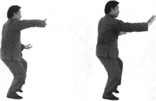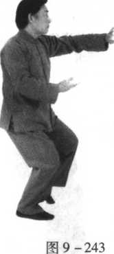口令3(图9 -242.243) 左掌外旋发力,掌心向前,同时右掌下沉内收至右腹前。