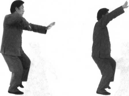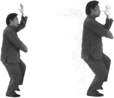 两臂继续划弧,呈左手上右手下时,左臂屈肘下沉,右掌变