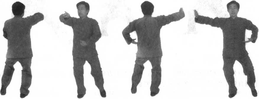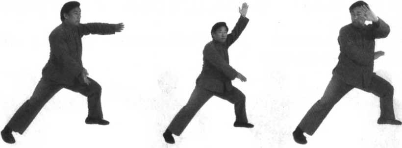 口令3 (图9 -820、821、822) 身体右转90度,重心左移,右脚尖外摆,两手背相对向外 搠与右肩平,手左内右外(面向东北)。