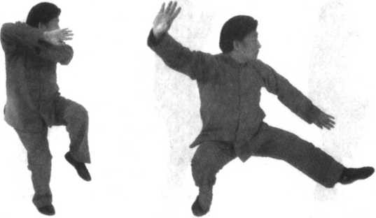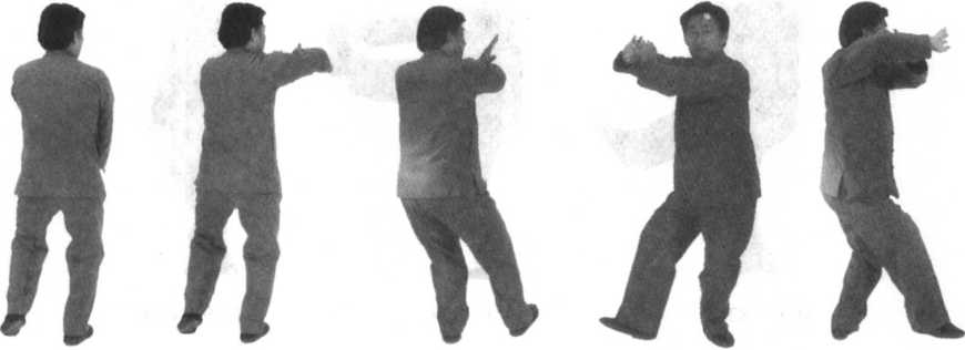 口令4 (图9 -823.824) 身体右转,重心移至右腿,提左腿向左前方开一大步,同时两手