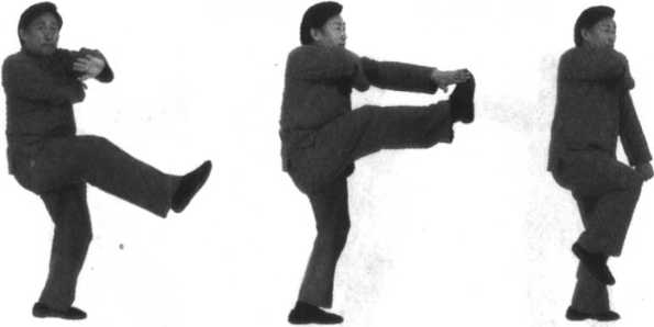 面后,右腿自然下落,左臂自然下垂,两掌变拳。