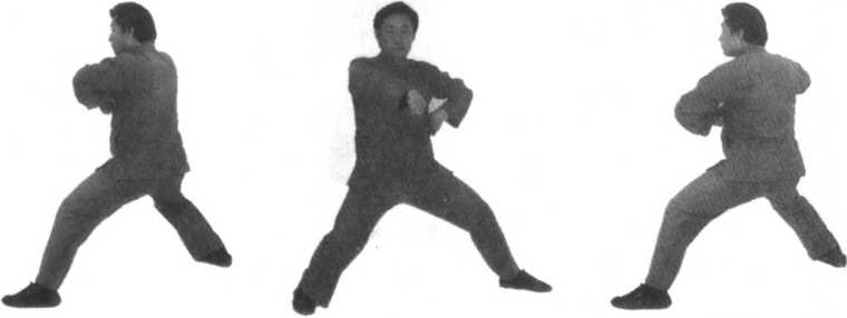 口令4 (图9 -864.865) 身体右转,重心移至右腿,右腿屈膝下蹲,同时双拳左下右上划