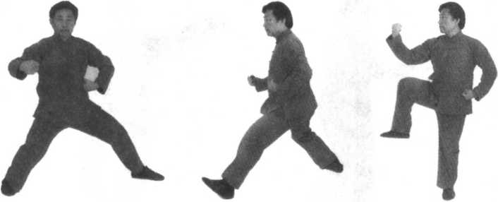 口令2 (图9 -848、849) 身体左转90度,重心移至左腿,右腿提起,脚尖下垂,同时右拳