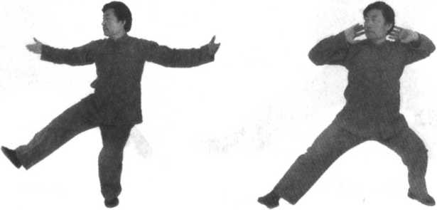 2.此势须掌握双手合后的螺旋上升。另外,置于左腰侧的左手,必须做到正确逆缠,须从外缠回到腰间,这也是使左 腿中正立稳的关键。