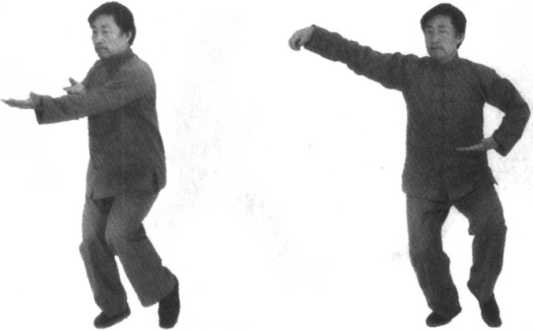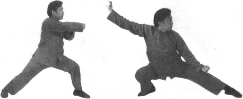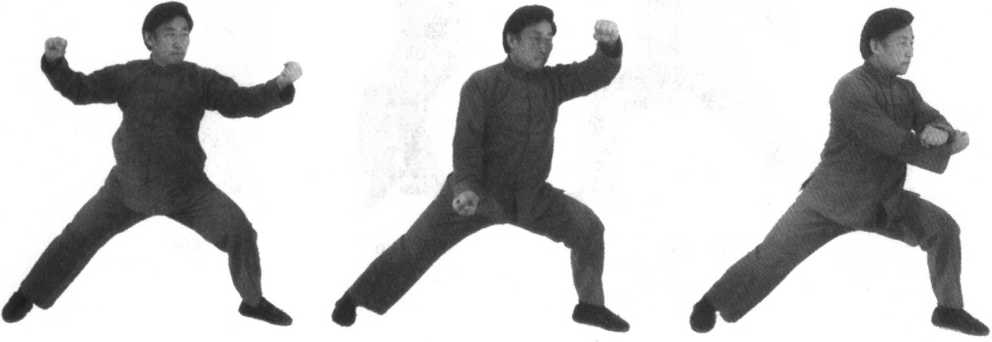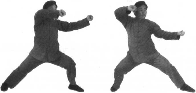 要点:1.此势由“左里逆缠和右外顺缠”带动,须毫无凹凸地使身体平旋而上;两手转为上下逆顺缠丝,将右拳缠到面前,左 拳缠到腰间,须毫无缺陷地完成,这是此势的着重点。