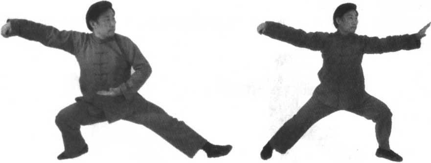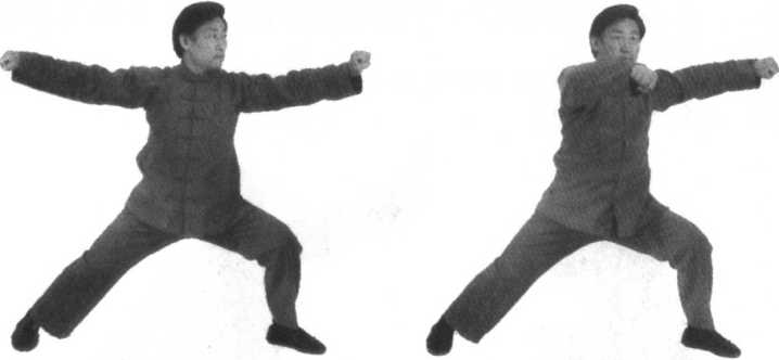 孤,左拳置于左腿内侧,右拳置于身体右上方,拳心相对(面向南)。