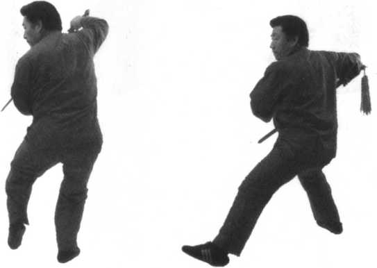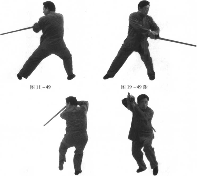 口令2(图11 -49.50) 重心移至右腿,屈膝松胯,左脚向右撤半步,脚尖点地,成左虚 步。同时,左手向右上外旋上摆180度,抱右手臂成两手握剑,由左侧向由上方外旋,推提至额前 方,剑尖朝左下方,目视左侧。(身朝西北)