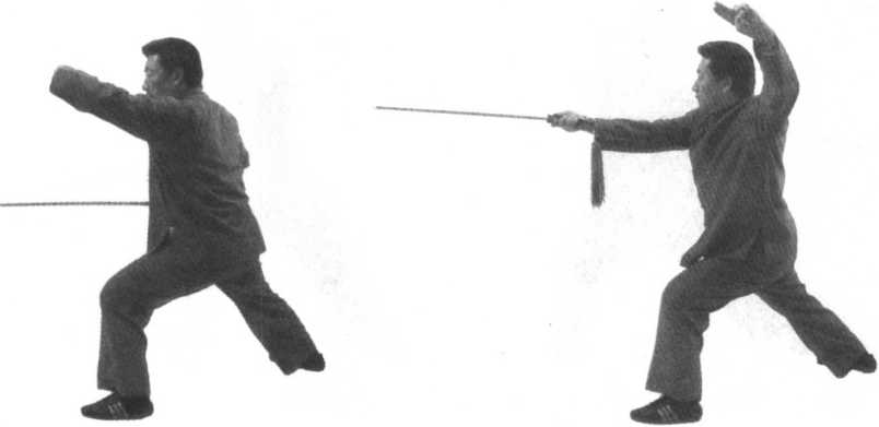 要点:劲由脚起,移裆扭腰,旋剑前刺,劲贯剑尖。