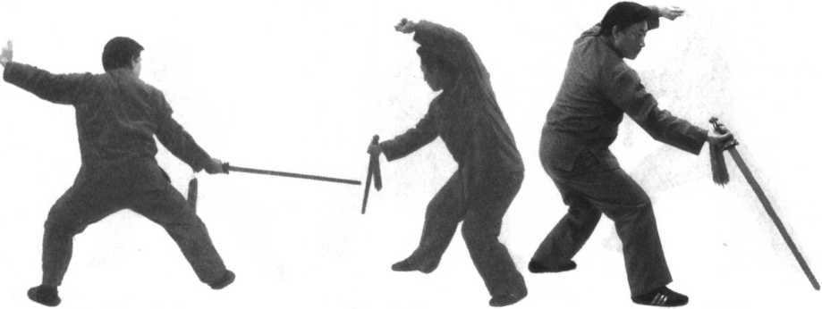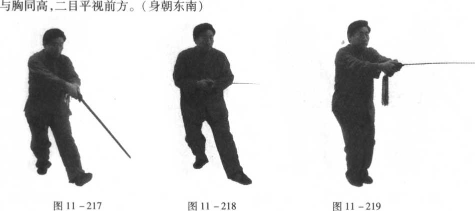 口令(图11 -218.219) 接上势。两手握剑内旋由立剑成平剑收于胸腹前。随即重心前 移至左腿,右脚跟进落于左脚内侧与左脚并立,两膝微屈。同时两手握剑由胸前向左前方平刺,