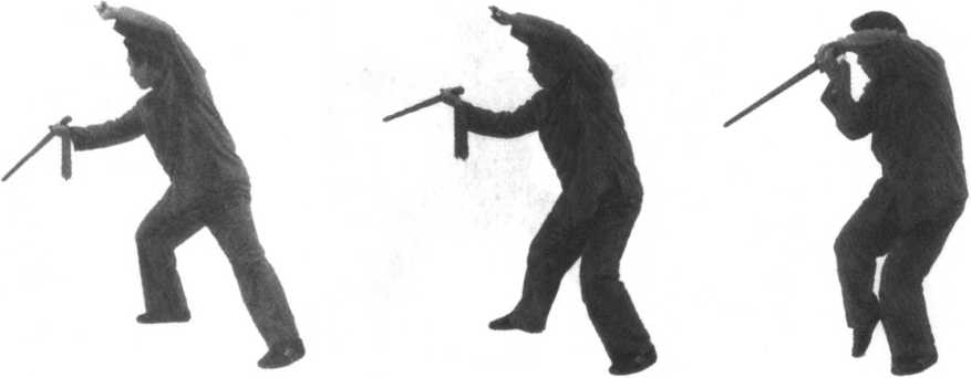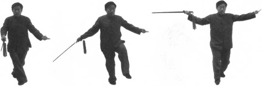 口令1(图11-210、211、212) 接上势。左脚踏实,重心移至左腿,身体微左转,随之右腿 屈膝上抬。同时右手握剑,右臂外旋,剑尖朝后下方,左手剑指内旋下落略高与头。目视右后方。