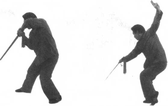 口令2(图11-213) 右脚经左脚前向左侧交叉落步,随即重心移至两腿之间。同时右 手握剑由后经身体右侧向前沿弧线向上向后点剑至头部右上方,划至胸前时,左手与右手相合握 剑,剑尖朝右后。目视右后方。(身朝西南)