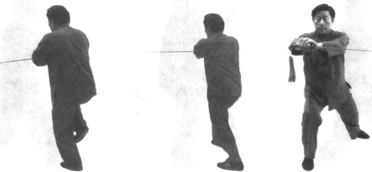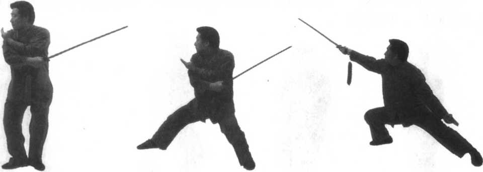 要点:松胯塌腰,劲合于左腿。抹剑时,塌腰转身,随重心移动,力达剑身。
