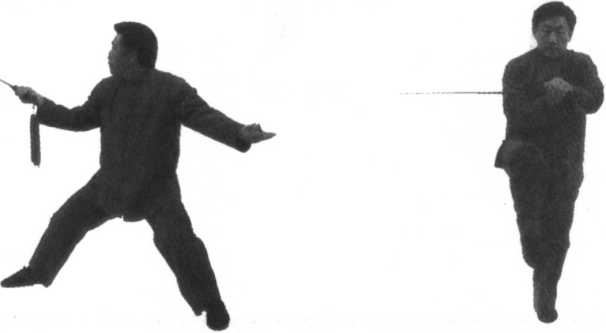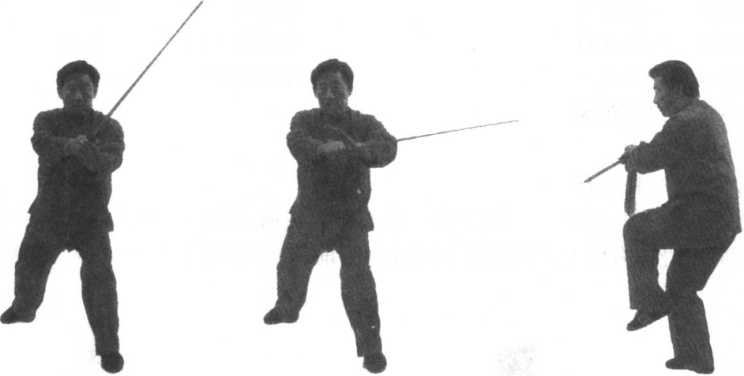 口令1(图11 -229.230.231) 接上势。重心移至右腿,随身体右转90度,左腿屈膝提 起。同时两手握剑,使剑尖向上经左划弧合于胸前,剑尖朝左。目视前方。