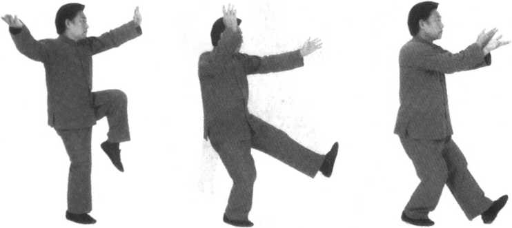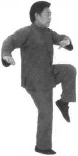 要点:左膝上提时,重心微下沉,两掌向右侧下缠要与左膝上提相对应,以保持身体平衡。两掌落于身体右侧接着缠至胸 前,要做到内劲不断;两臂交叉时须合住劲,然后分向左右,意贯拇指上,同时重心微下降,气沉丹田。