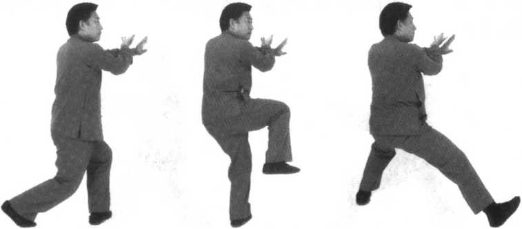 重心移至左腿,收右腿向右前方上步。(面向东北)