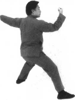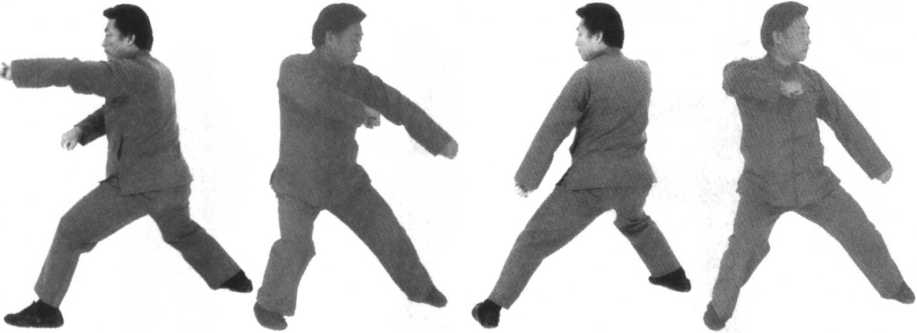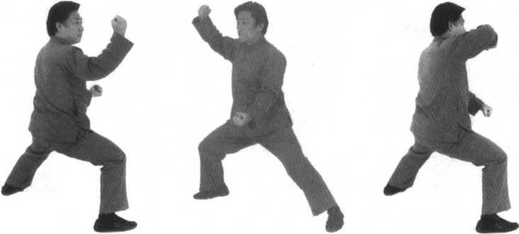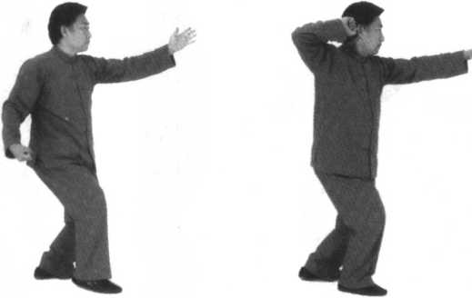 同时左拳向上向前屈肘于左肩前上方,右拳向前下方置于身体右侧。