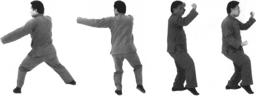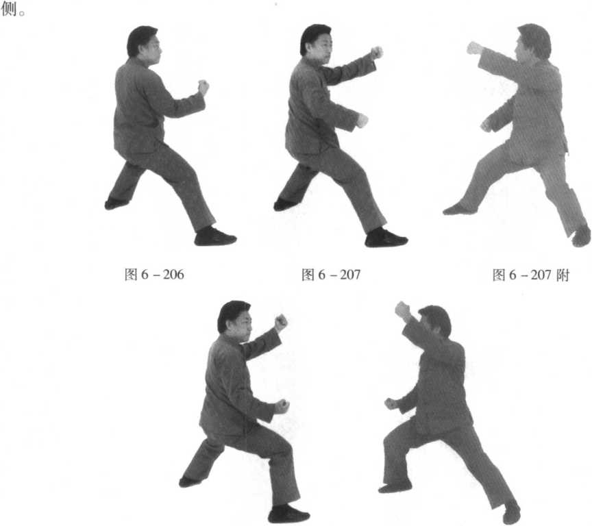 口令4(图6 -206.207 .208) 重心右移,左拳内旋收于左前方,右拳向下向外内旋置于右