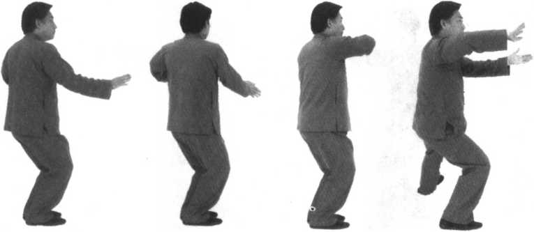 口令1(图6-196至199) 重心右移,提左脚向左侧后方横开一步,同时身体先左转再右