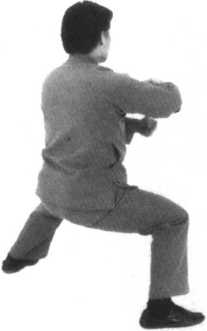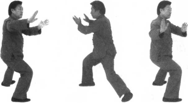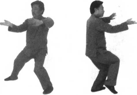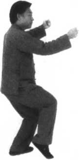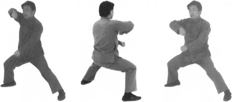要点:此势要求里外缠丝,节节贯串,周身一致。裆口要圆而低,两腿虚实变换要分清,才易感知会阴之气上冲尾闾。右 拳上举,左拳外旋向下时,注意左肩放松下沉,成扩胸的动作。