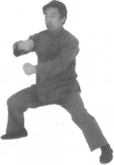 拳于左侧上方略高于肩,右拳于右胸前,拳心向里。