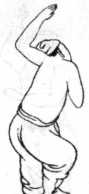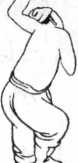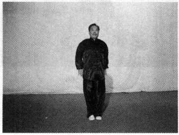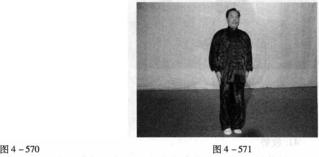 肩同高,撤右腿,双掌向后摆,重心后移,双掌经体侧上举,掌心相对,收左脚并步, 双掌下按收势,目视前方。(图4-568 -571)