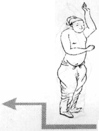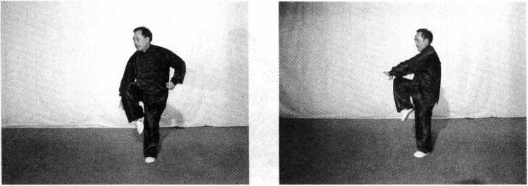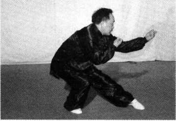 双拳合与头顶向两侧画圆,经带口向左侧抄拳,左拳与肩同高,右拳收于左臂 肘内侧,拳心向上,同时提右腿震脚,左腿收回向左侧点地成虚步。(图4-567)