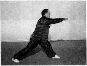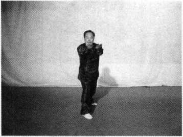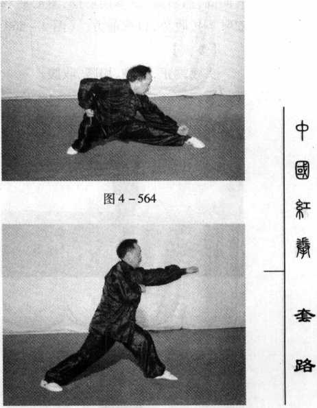 右转90。提右膝,右掌搂膝向右侧上右脚。同时左勾变掌经头顶盖掌,右掌经 左掌背穿出变反勾手,左转,右腿下蹲成铺步,同时右勾变拳收带口,左掌变拳撑 出,弓步冲拳。(图4-561 -566)