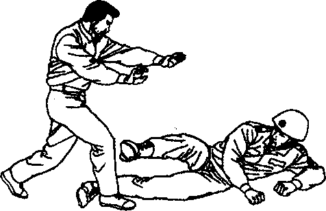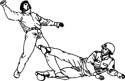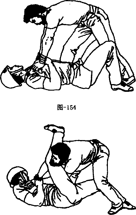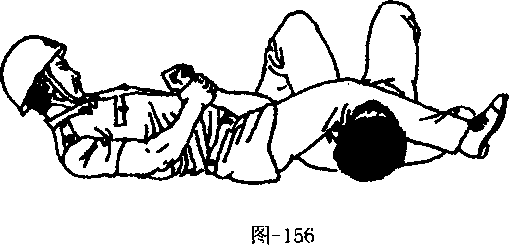 介绍警察地躺反击法后接下去讨论警察被歹徒按倒在地的反击法如图-154所示。警察用力从外向里推按歹徒肘部紧接着身体稍往左翻右脚提起到歹徒右颈侧(见图-155)
