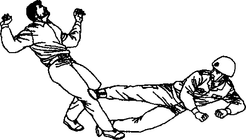 另外一种是警察倒地后左腿扣牢歹徒右脚右脚外侧蹬压歹徒右小腿胫骨下端的外面左肘撑地上身稍起使歹徒向