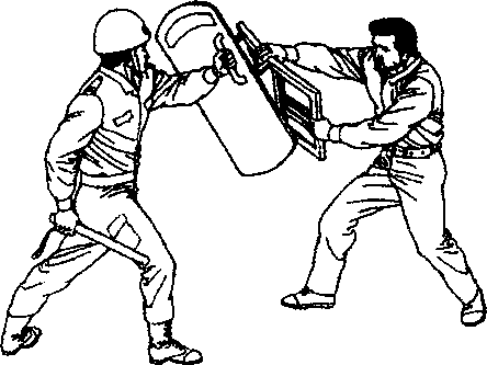 随即左臂上举用盾牌底部挑击歹徒的胸部或面部(见图-201)。
