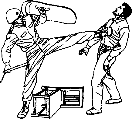 警棍上端装有棒芯加上棍体是铝合金属管打击的力量是相当可观的。紧接着警察踮步左脚横踹蹬歹徒的胸部(见图-203)