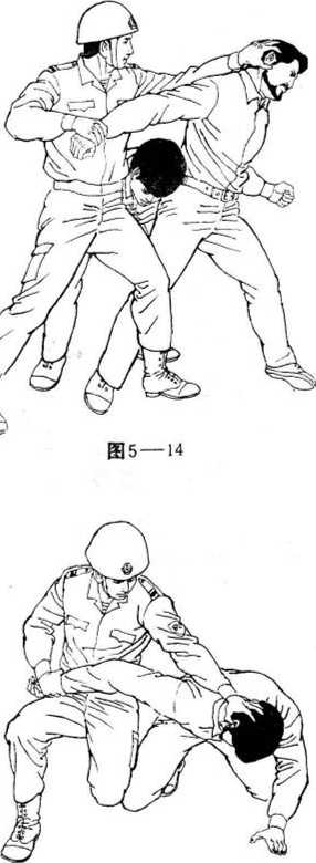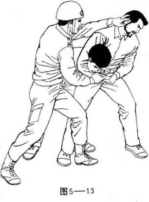 压痛会使歹徒的抓握立即松开,公安干警随即将其胳膊 向上拉,并把它横在自己的胸前。(见图5-14)