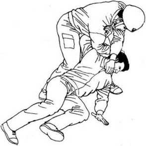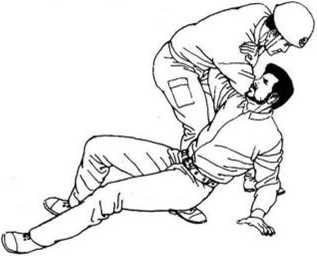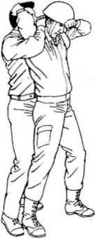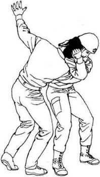 歹徒从后,从警察双腋 下穿过扣压后颈部,将公安 干警的肩、颈、头部牢固锁 紧,控制全身(见图5-72)