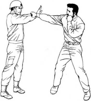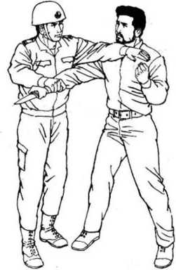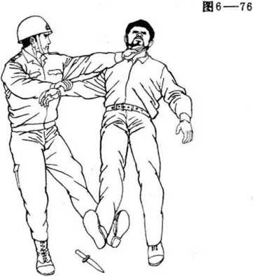 如图6-74所示,歹徒持刀直捅警察头、喉部。警察右手从里向外横挡歹徒持刀右腕,横力破直力,如同 对面有人骑车快速冲过来,以直对直,即使对方倒地,自己也 伤敌一千,自伤八百,不合算,倘闪到旁边,从侧边踹去,便可 使对方人翻车仰,而自己却安然无恙。在与歹徒持刀右腕相碰的瞬间,警察顺势滚动,虎口张 开,抓住其腕。(见图6-75)图6——77图6——77抓住歹徒右 腕同时,右转身, 左手横击歹徒喉 部,左脚勾踢歹 徒右脚,两力合 发,使歹徒身体 后仰倒地。(见图 6—76,6—77)图6——77图6——77