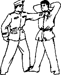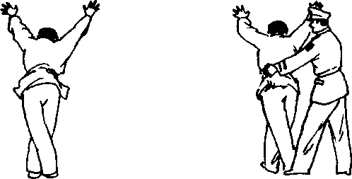 令罪犯两手分开爬于墙壁、树木等物体上两脚交叉站立距墙壁、树木等物体1米,我位于罪犯的侧后方左脚抵住罪犯的后脚跟两手前后上下左右反复搜查(图571、572)。