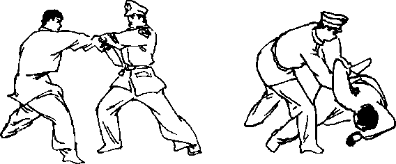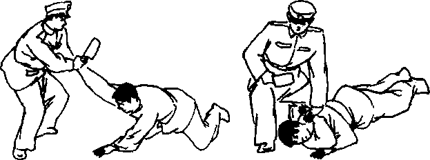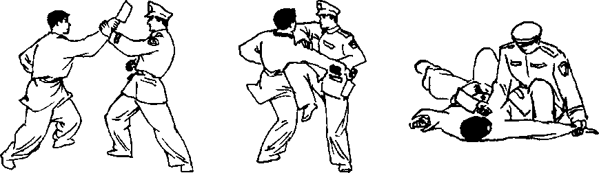 其裆部。而后右腿落于罪犯腿后小腿三头肌用力向后绊打。同时右肘尖用力横扫其咽喉。绊打、横扫相错用力将罪犯摔跌倒地。我迅速向前下方蹲身右膝盖下砸其肋部。左手控制其右腕右手握菜刀制服罪犯(图585、586、587)。