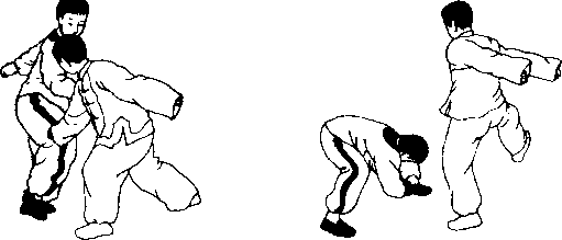 下。如图2—140。甲右腿被踩跪地,同时上身向 左上翻转,左腿屈膝以左脚向乙左胯蹬出,如图 2 — 乙左胯被蹬后弓背屈身,以右肩着地抢 背滚翻,如图2 — 142。