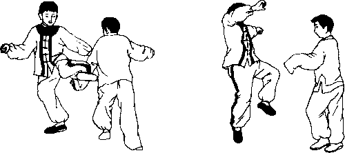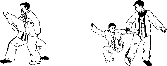 (1)叫腿打虎势:甲、乙二人做本书 第二章第二节三、2.“叫腿打虎势”动作, 读者请参考该处的动作说明及图2- 143 至图 2 — 145。