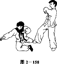 乙右脚弹踢时,甲 左脚贴地一跳向后抽撤,同时上身左转 180度,右脚提起蹬踩乙右腿弯内侧,乙 被蹬踩倒地,如图2 — 158。