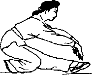 移左脚,右脚跟提起脚掌点地,两 手随体向前推出,掌心向前高与 肩平。右腿后退半步,重心后移. 下蹲坐于右后脚跟,左脚伸直为 虚步脚尖外撇45。( IV ),同时双 手向下回按至胯旁。然后双手上 提由腰中穿出,体前值尽量胸面 贴腿,双手随体前俯之时沿腼两 侧前击。(图11 —1)身体回收双 乎回按,收至小腹前,接连以臂向