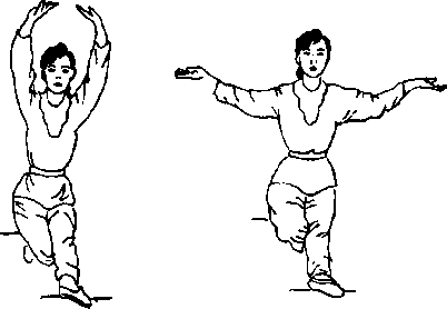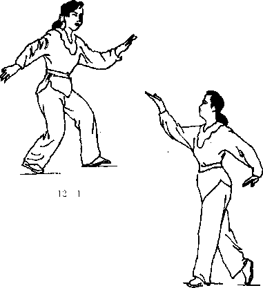 接上式身体起立,重心移于左脚,右脚跟提起前脚掌点地,同 时两手手心向上体前直臂合拢至两掌间一拳宽。重心移,右腿,同 时体右转右手向后划弧自腰间穿出,眼看右方,(图12—D接连体 左转左手卜■按于左胯后,眼看左方。右手上托高于耳平,同时重心 移左脚,右脚体后虚点。(图12 2)