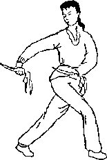 2 .左脚横步,左手握双匕经体前,升至右上方,略过头顶。接着 右脚于左后方插步,右手接一匕 首,左右手同时右手上提,左手下 刺,两臂成一斜直线。目视左下 方。(图2-1)