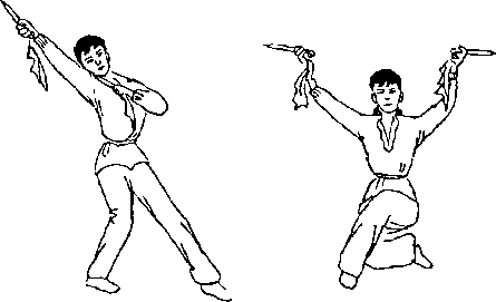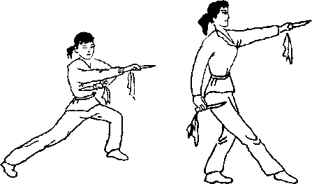 接上式,起立提右腿,左手 前、右手后,双匕由下向上反 撩,接上右步,右手前,左手后, 由下向上反撩,右脚落地左脚 后提,上身前倾,两匕左前右后 同时平刺成一字型,拳背向上, 匕剌成45度(向下斜指。 (图10—1)收左脚向前跨出成 左弓步,两手握匕收回,右手握 匕前刺,左匕护于胸前,匕刺朝 右。(图10—2)右脚上前成右 虚步,同时,重心移至右腿,弹左腿,右手向前刺出,接着又收右匕 于右身侧,左手握匕前刺(瓜兀(图10—3)